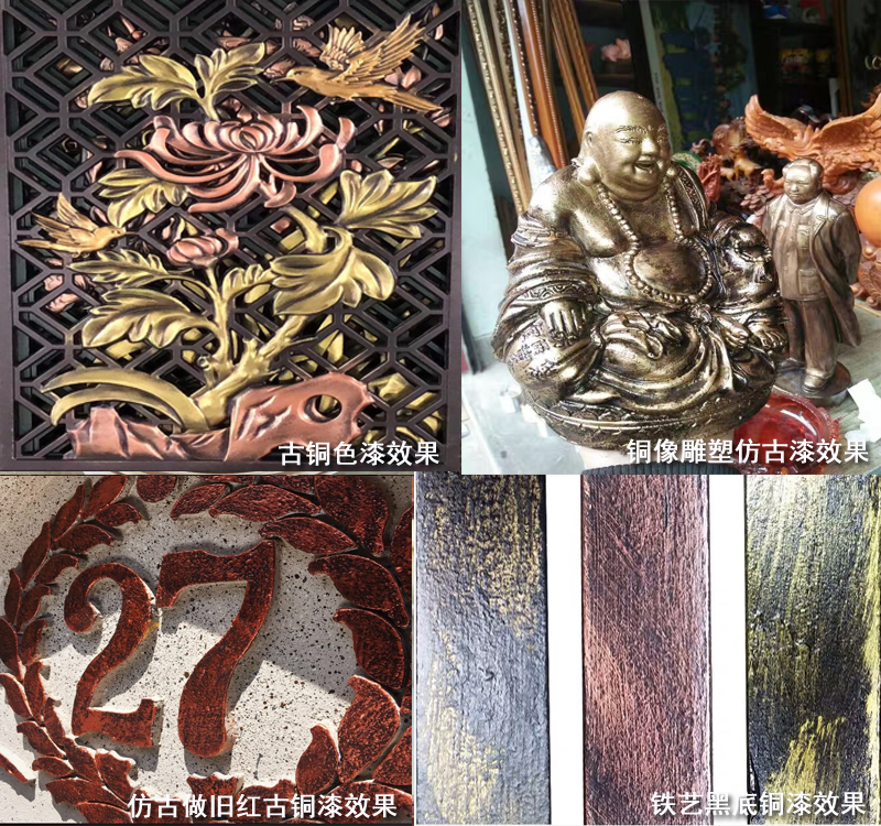 適用范圍:用于裝飾工程、廣告招牌、戶外雕塑、鐵藝護欄、五金制品、木制品、樹脂飾件、塑膠工藝品等產品的表面裝飾達到仿古的裝飾效果。